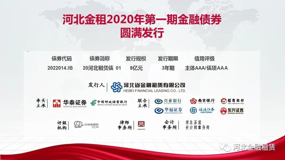 日前,河北省金融租賃有限公司(以下簡稱“河北金租”)2020年第一期金融債券成功發(fā)行,發(fā)行規(guī)模8億元,期限3年。此次河北金租發(fā)行的金融債券場內(nèi)認(rèn)購倍數(shù)達(dá)到2倍,投資人認(rèn)可度較高,債券所募資金將主要用于清潔能源、節(jié)能環(huán)保、醫(yī)療健康等公司戰(zhàn)略行業(yè)項目投放,同時積極助力新冠肺炎防控,為防疫醫(yī)療設(shè)備商和服務(wù)商、新冠疫情定點醫(yī)療機構(gòu)提供金融服務(wù),支持湖北等地區(qū)公共事業(yè)及工程裝備制造等行業(yè)發(fā)展。