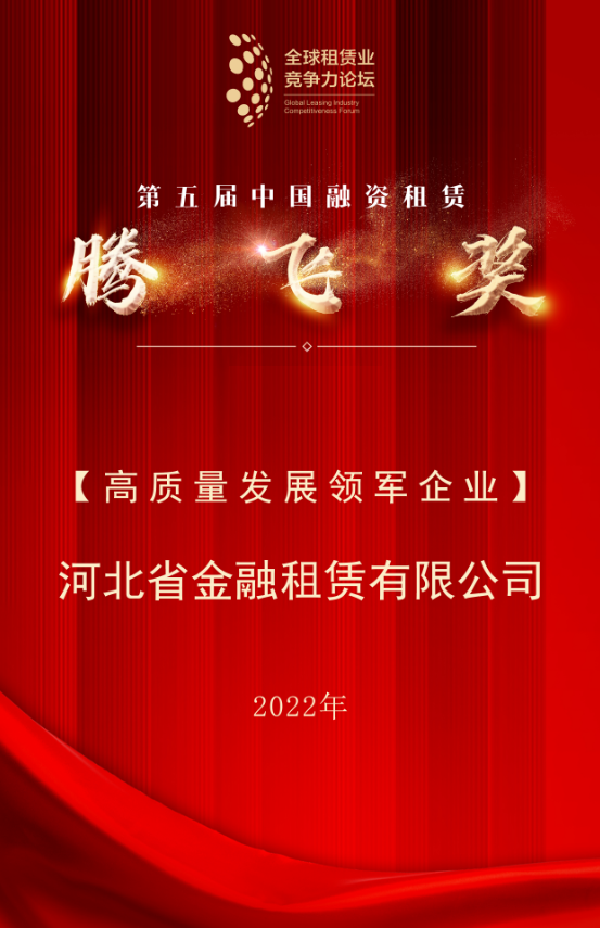 日前,第九屆全球租賃業(yè)競(jìng)爭(zhēng)力論壇年度峰會(huì)圓滿召開,河北省金融租賃有限公司(以下簡(jiǎn)稱“河北金租”或“公司”)再度攬下中國融資租賃“騰飛獎(jiǎng)”,榮獲“高質(zhì)量發(fā)展領(lǐng)軍企業(yè)”榮譽(yù)。